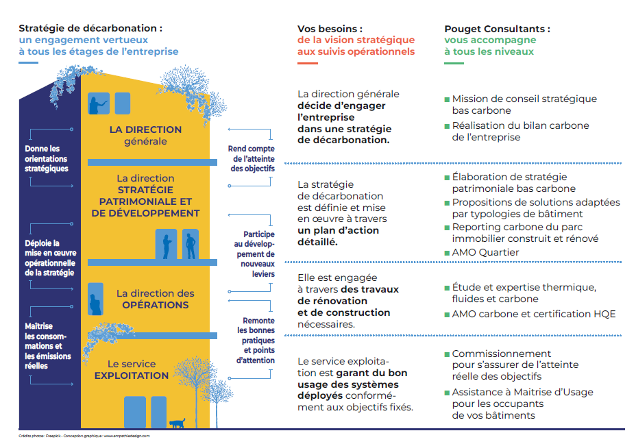 Nous vous accompagnons dans l’élaboration de votre stratégie bas carbone de la réalisation du Bilan Carbone® au déploiement opérationnel en cohérence avec vos propres objectifs d’entreprise (RE 2020, Loi Climat Résilience, etc.).
