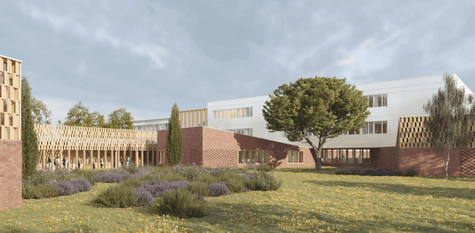 Réhabilitation et extension du collège Cacault, enseignement et restaurant scolaire à Clisson BBC rénovation / E3C1 – avec chaufferie bois et panneaux solaires – réemploi