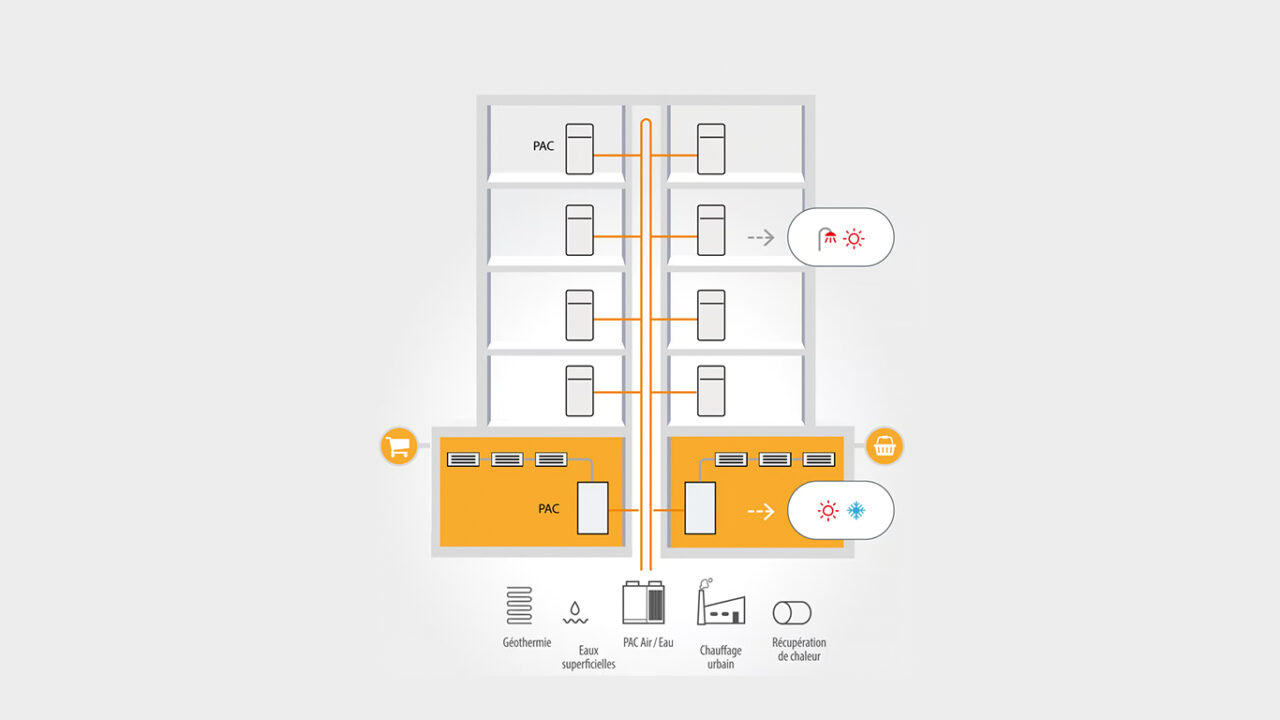- 1 PAC individuelle eau/eau dans chaque logement, produisant du chauffage, l’ECS et du refroidissement (si besoin)