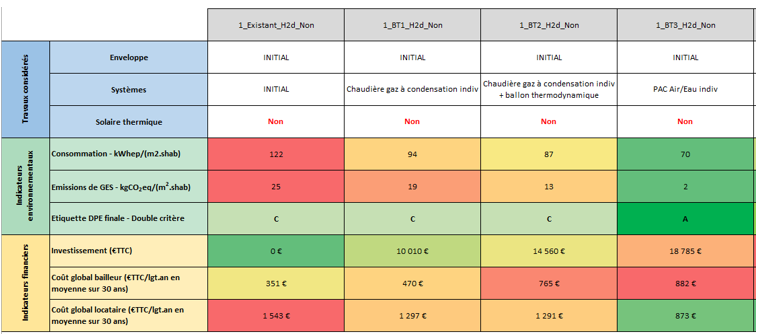 Une fois les typologies de patrimoines définies, une évaluation multicritère incluant une analyse en coût global est réalisée afin d’évaluer la pertinence de plusieurs bouquets de travaux (enveloppe / systèmes) sur des critères environnementaux, économiques (pour le bailleur, pour le locataire), DPE, etc.
